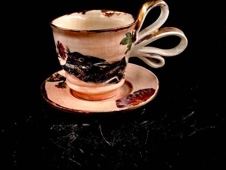 Ein Tasse für Hasenliebhaber, oder Jäger. Verrückt der dreifach gescnörkelte Henkel und das goldenen Ornament. Wirklich einzigartig und crazy.